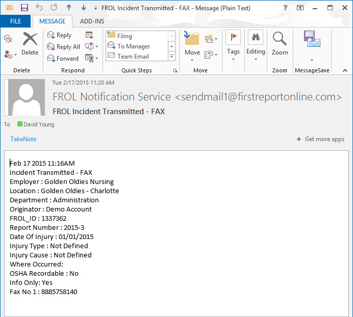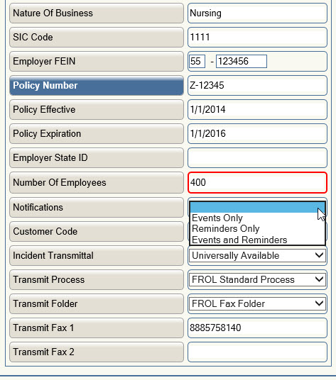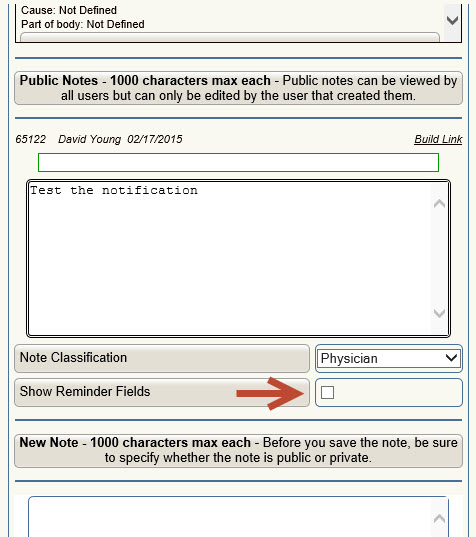 4. Once reminder based notifications are enabled for an employer, users can create reminders. Since each reminder is a stand-alone entity, the user has to enter all of the information (Responsible Person, Target Date, Completion Date, Notification Email, TXT Notification Email) each time a new reminder is created. Once a completion date is entered, the reminder is considered finished and no more notifications are sent. (See screens Note Transmit and Note Create)